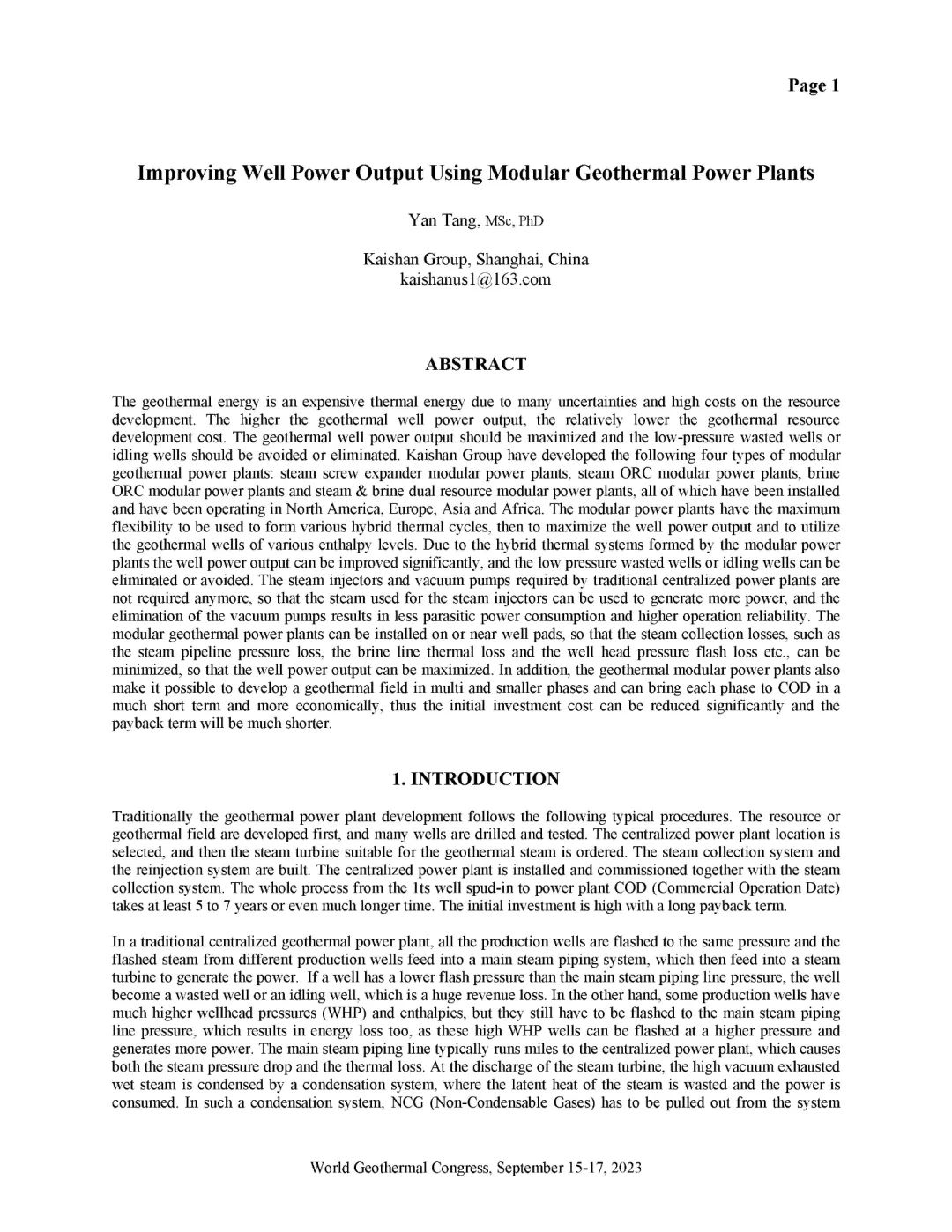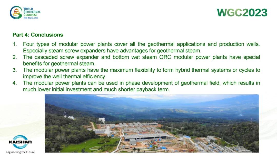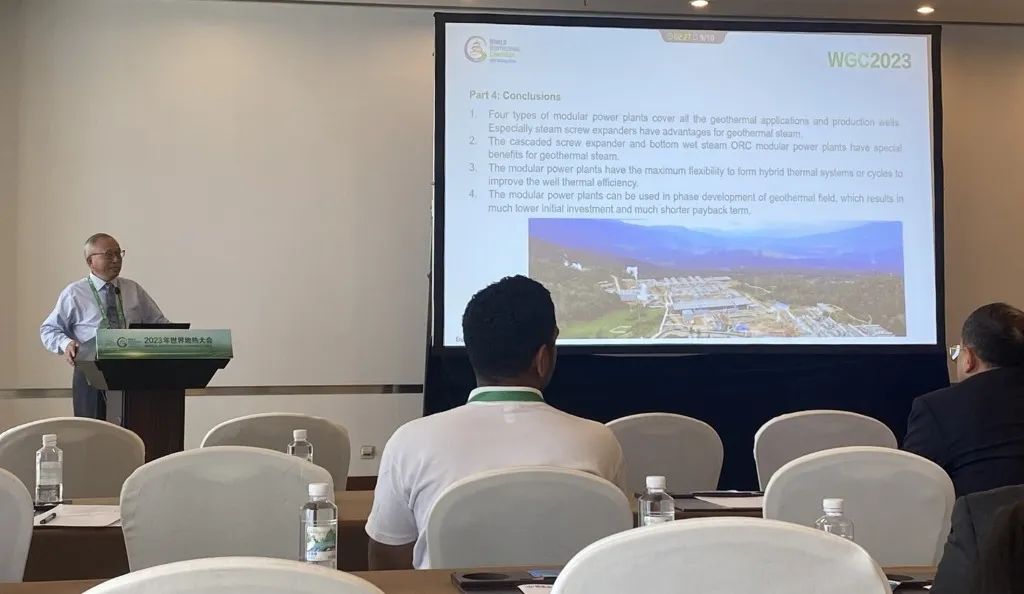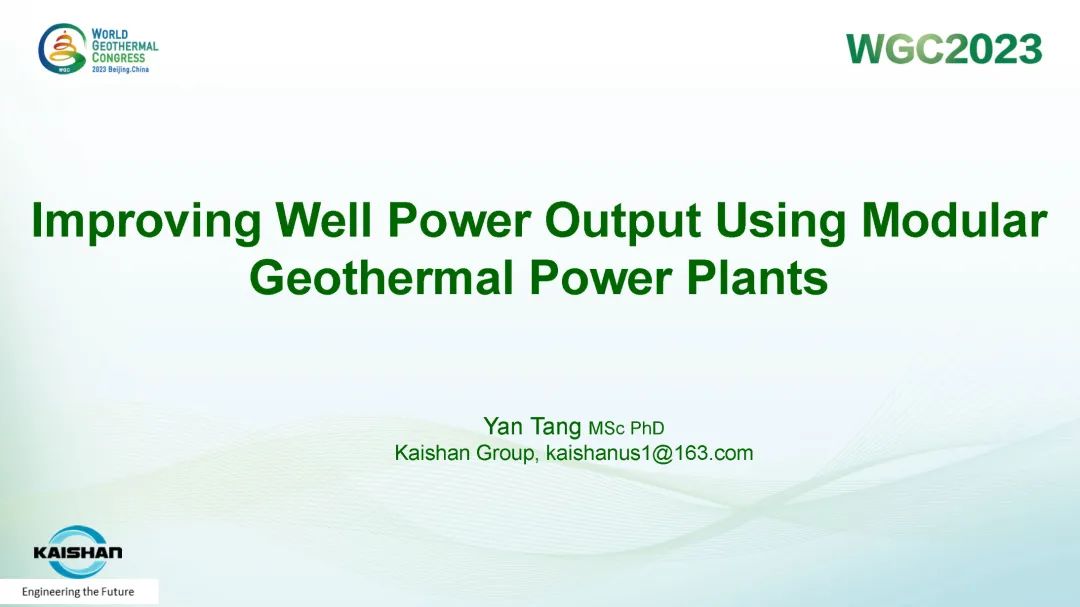 9月16日,公司總經理、開山地熱井口模塊發(fā)電技術創(chuàng)始人湯炎博士參加2023年北京世界地熱大會(WGC),并受國際地熱協(xié)會(IGA)首席執(zhí)行官Marit Brommer女士邀請,做了題為《使用地熱模塊電站提高地熱井產量》(Improving Well Power Output Using Modular Geothermal Power Plants)的專題報告。