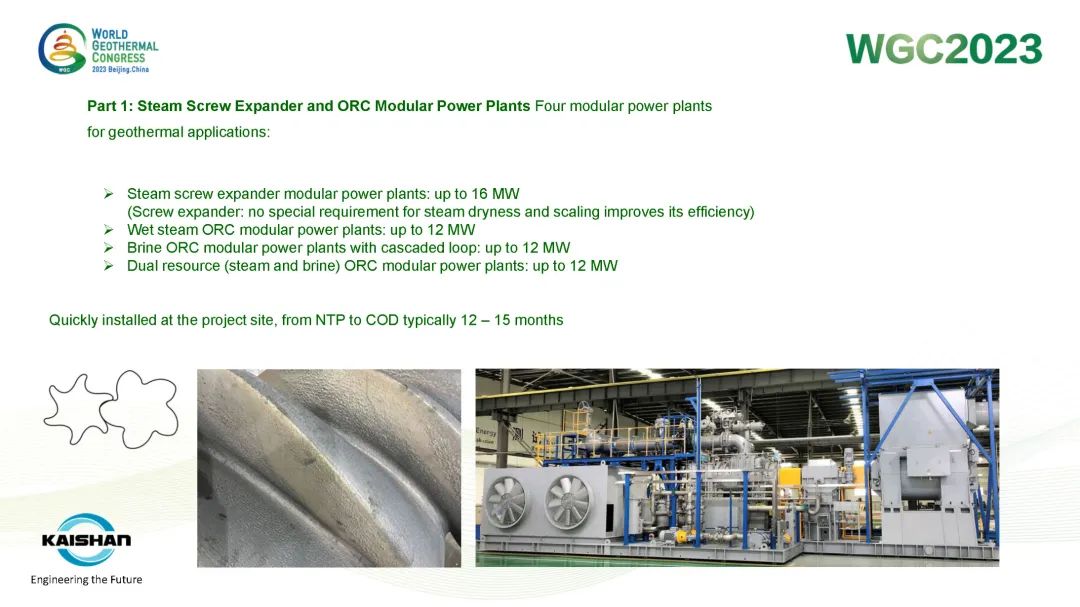 湯炎博士在報告中指出,地熱開發(fā)應最大限度提高井的發(fā)電量,避免產生低壓井或閑置井。開山成功開發(fā)的蒸汽螺桿膨脹機模塊電站、蒸汽ORC模塊電站、鹽水ORC模塊電站和“蒸汽+鹽水”模塊電站可根據(jù)不同溫度、壓力的地熱資源提供最靈活、高效的熱力循環(huán)系統(tǒng),最大限度提高地熱井功率輸出。