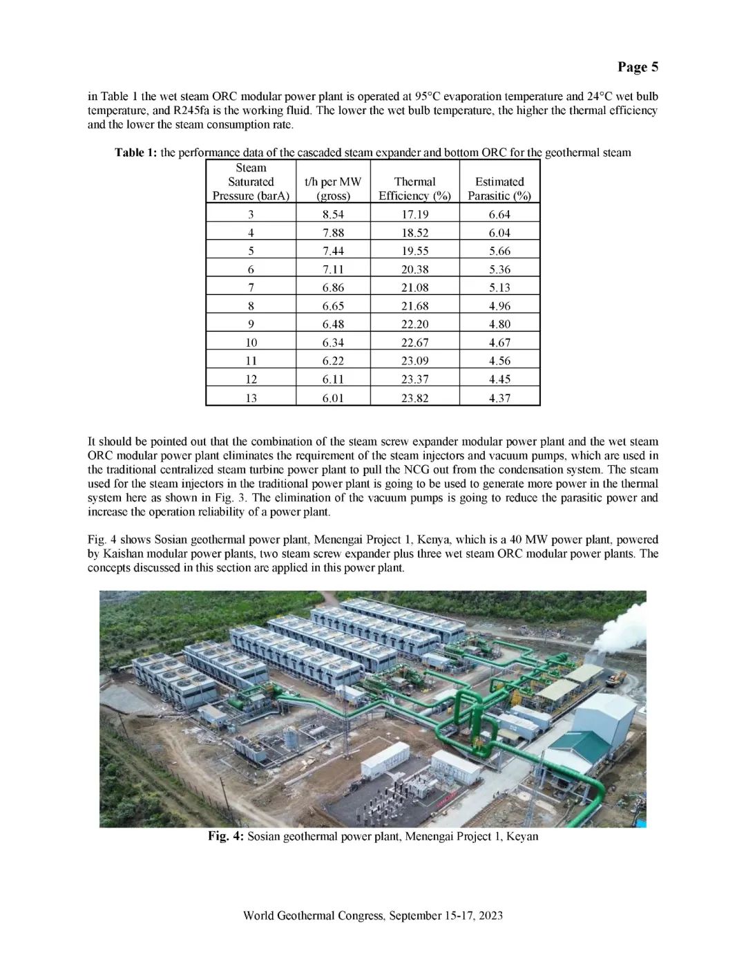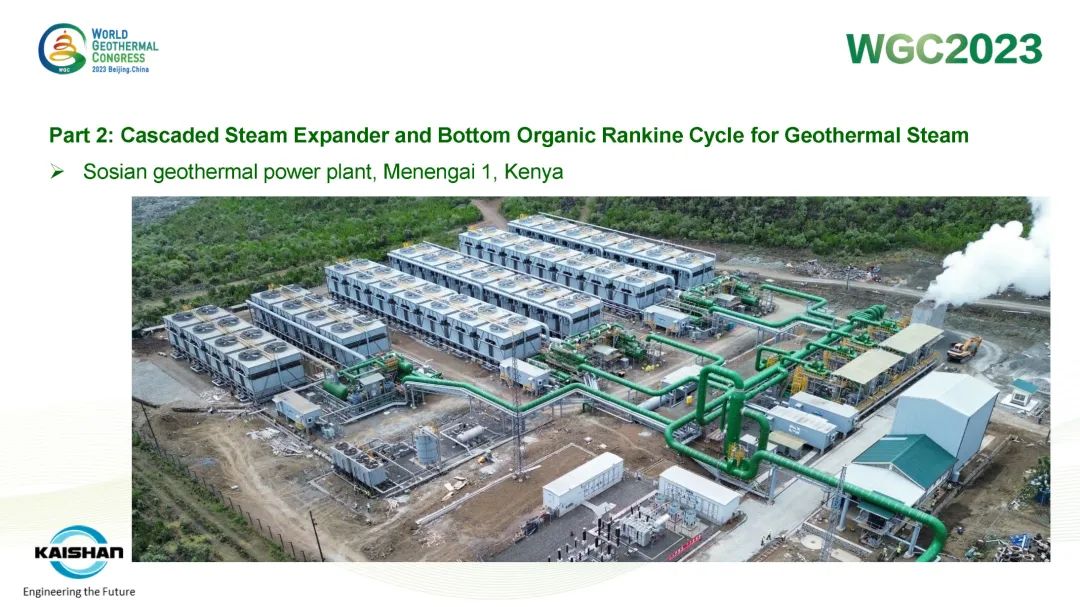湯炎博士著重介紹了由開山EPC建設的肯尼亞Sosian-Menengai地熱電站及開山自主開發(fā)、建設、運營的Sorik Marapi地熱電站成功案例。Sosian-Menengai地熱電站采用“蒸汽膨脹機+濕蒸汽ORC膨脹機”模塊電站串級循環(huán),無需采用傳統(tǒng)中央電站分離不凝性氣體的蒸汽噴射器和真空泵,從而降低了電站寄生負荷、提高其發(fā)電效率。Sorik Marapi項目是公司各類型模塊電站的集大成者,高壓蒸汽井、低壓蒸汽井、熱水井熱源均可得到充分利用,進而使項目實現(xiàn)“無閑置低壓/低溫井”。模塊電站“量體裁衣”式的解決方案通過提高井熱效率改善了地熱開發(fā)的經濟性,也通過獨樹一幟地有效利用低壓地熱井及熱水井,顯著降低了資源鉆探的單位成本。