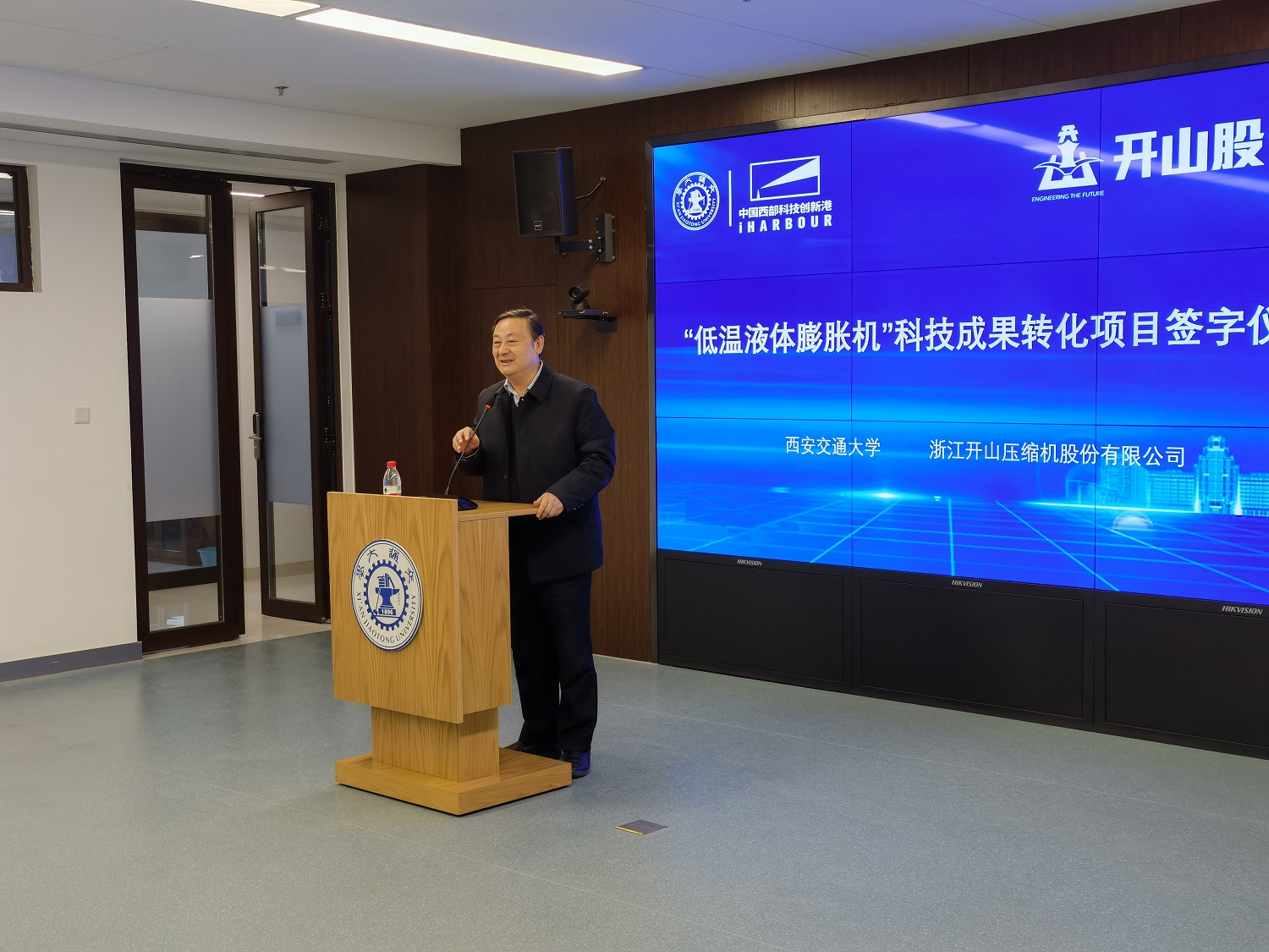 12月23日下午,在西安交通大學(xué)副校長(zhǎng)王鐵軍和浙江開(kāi)山壓縮機(jī)有限公司董事長(zhǎng)曹克堅(jiān)見(jiàn)證下,西安交大科研院常務(wù)副院長(zhǎng)黃忠德與開(kāi)山壓縮機(jī)公司副總經(jīng)理?xiàng)罱ㄜ姺謩e代表雙方簽署“低溫液體膨脹機(jī)”科技成果轉(zhuǎn)化項(xiàng)目協(xié)議書。雙方將在西安交大創(chuàng)新港設(shè)立由開(kāi)山股份控股的創(chuàng)新平臺(tái)公司——開(kāi)山透平有限公司(KAISHAN TURBOMACHINERY CO.LTD.),旨在研發(fā)包括低溫液體膨脹機(jī)”在內(nèi)的透平機(jī)械產(chǎn)品。